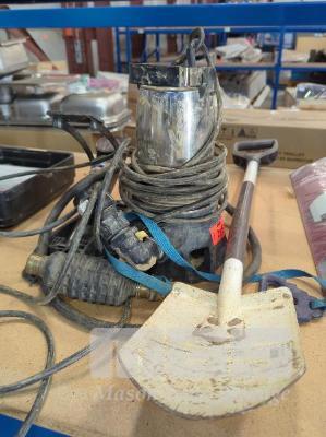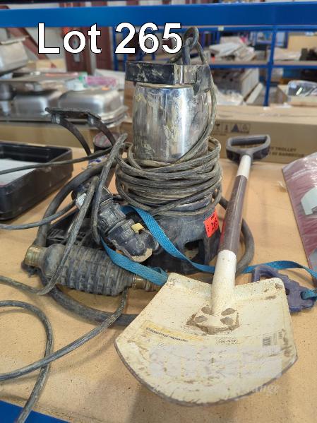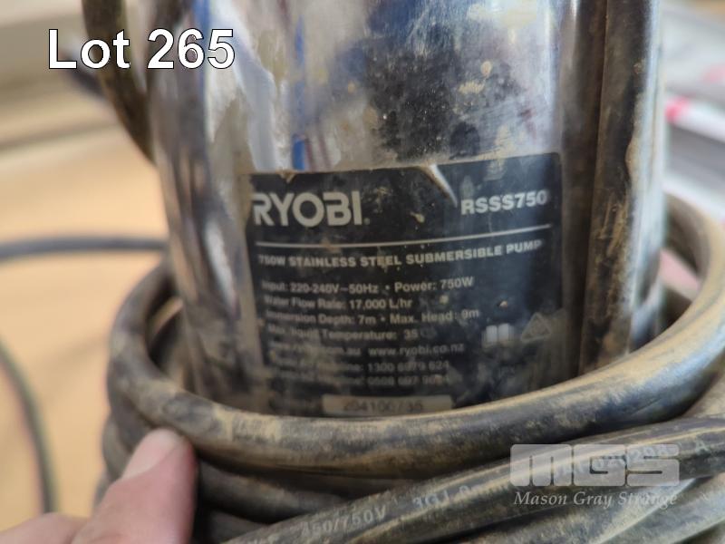 1 X RYOBI SUBMUSIBLE PUMP MODEL RSS750, FOOT PUMP, DIGGING SPADE & EXTENSION HOSE.
