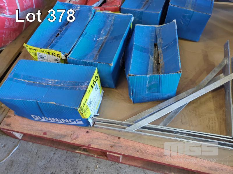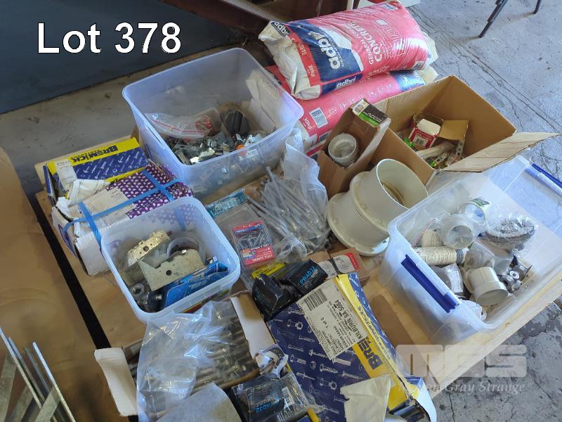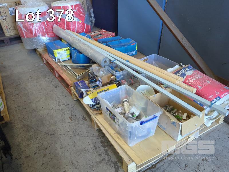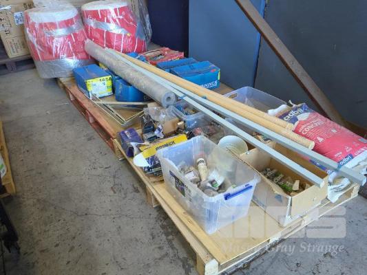 COLLECTION OF ASSORTED CONSTRUCTION MATERIALS. INCUDES GENERAL PURPOSE CEMENT BAGS, ROCKWOOL INSULATION, BRACKETS, FIXING SCREWS, BOLTS, TUBE DOOR LATCHES, GAS REGULATORS, ADHESIVE TAPE AND MORE (3 X PALLETS)
