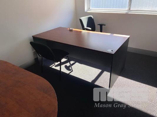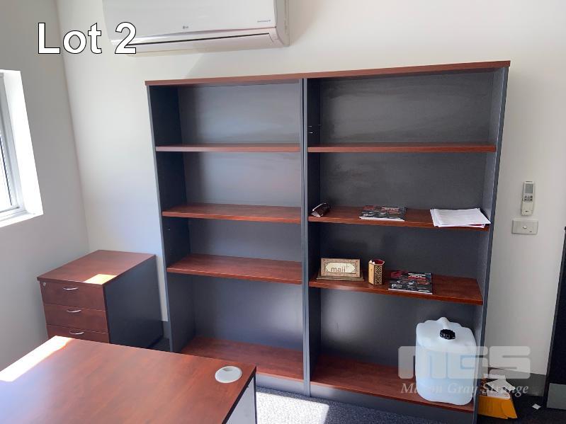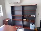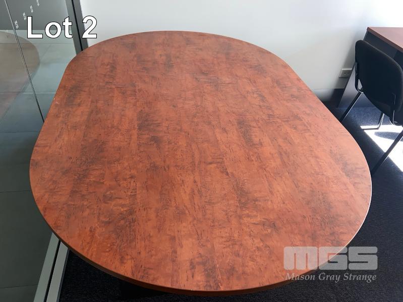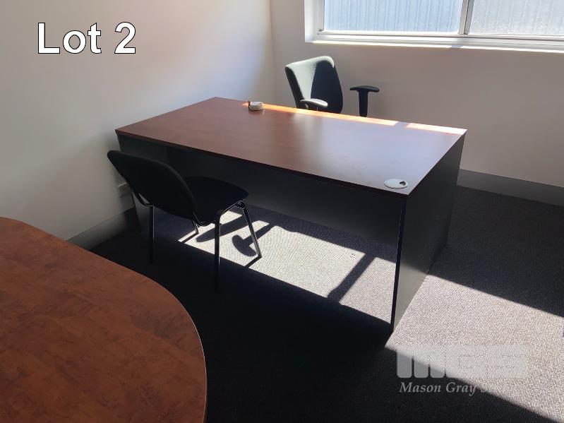 OFFICE CONTENTS TIMBER LAMINATE DESK AND MEETING TABLE, GAS LIFT CHAIR AND VISITORS CHAIR AND UNDER DRSK MOBILE . 2 x BOOK SHELVES .