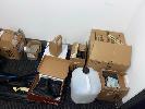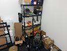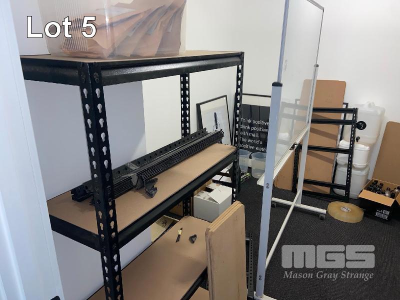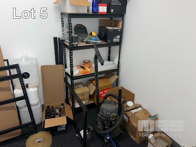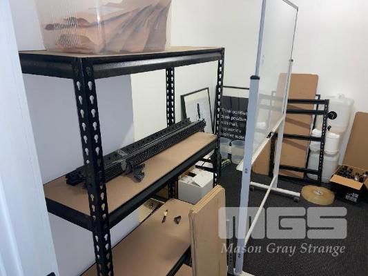 CONTENTS STORE ROOM INCLUDING MOBILE WHITEBOARD, OZITO WET/DRY VAC, 5 x MODULAR SHELVES, BLACK STEEL, WHITE DRUMS, BOTTLE & MORE