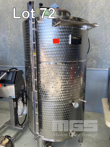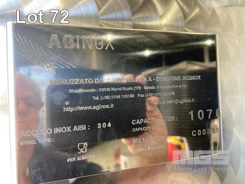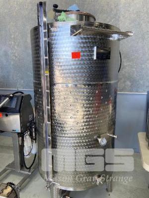 AGINOX JACKETED STAINLESS STEEL UPRIGHT TANK 1076 LITRE 304 S/S S/NO: C00880 CENTRE BASE OUTLET WITH VALVE INSPECTION HATCH TO TOP TEMPERATURE GAUGE HIGH/LOW VOLUME SENSORS , FLOAT GAUGE.