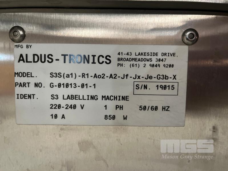 LABELLING MACHINE, ALDUS-TRONICS MOD: S3S(A1)-R1-A02-A2-GF-GX-JE-G3B-X S3 LABEL MACHINE S/NO: 19015 BELT WIDTH: 115mm STAINLESS STEEL CHASSIS
