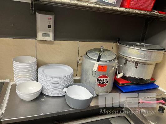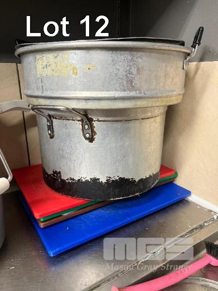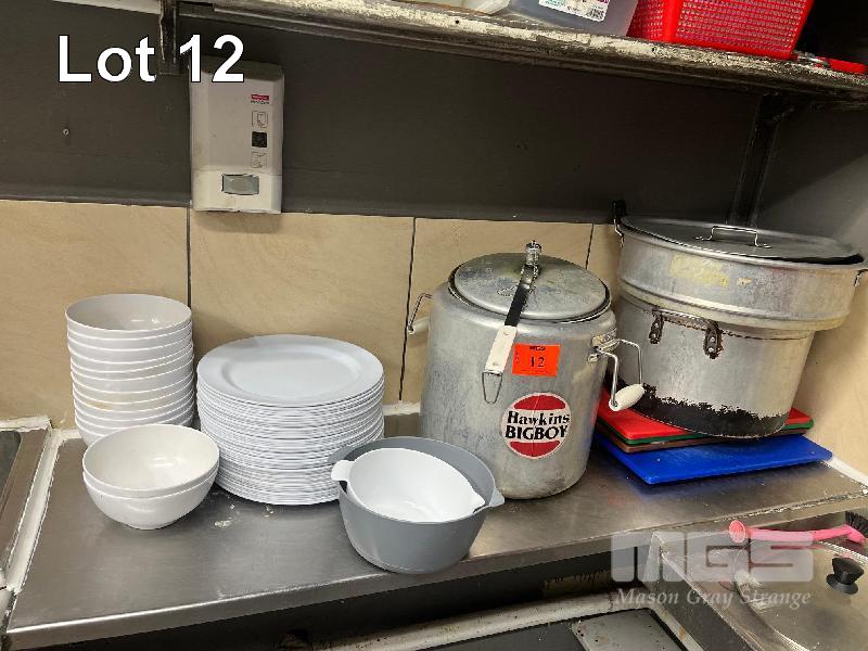 HAWKINS BIGBOY PRESSURE POT, 12L STOCK POT, 15L STOCK POT, STEAMER POT WITH LID, 7 x NYLON CUTTING BOARDS, ASSORTED MELAMINE PLATES & BOWLS