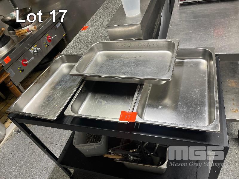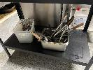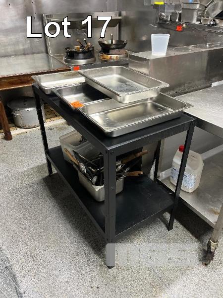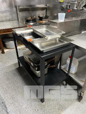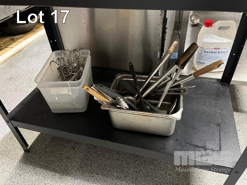 6 x GASTRONORM TRAYS, 530 x 325mm, LARGE QUANTITY STAINLESS STEEL HOOKS & COOKING UTENSILS, 2 TIER STEEL BENCH