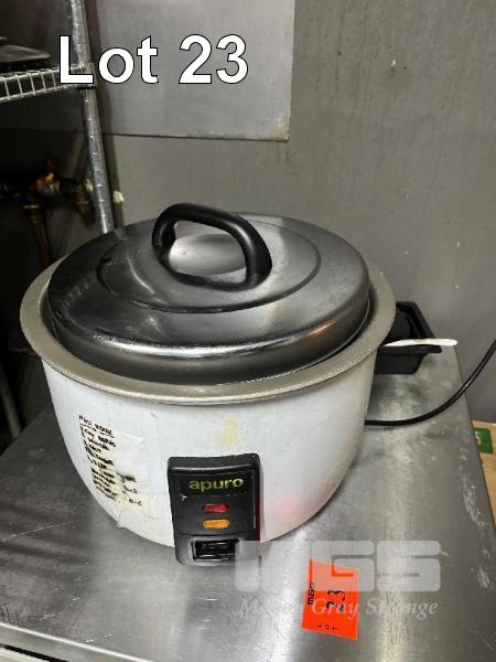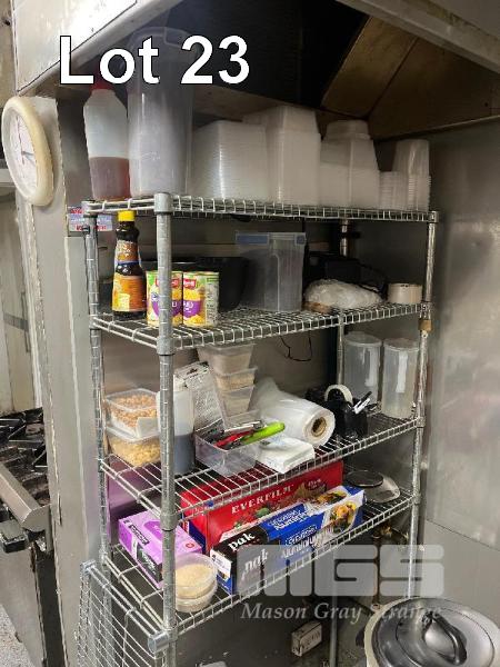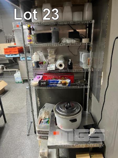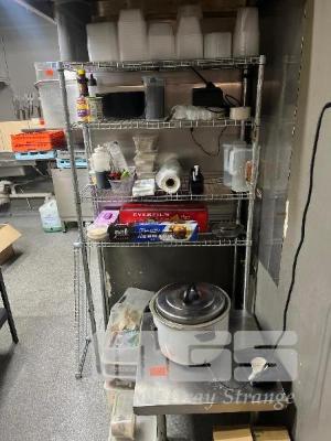 4 TIER RACK & CONTENTS, VARIOUS TAKE AWAY CONTAINERS, FOOD WRAP & FOIL, APURO RICE COOKER, ON LOW STAINLESS STEEL STAND