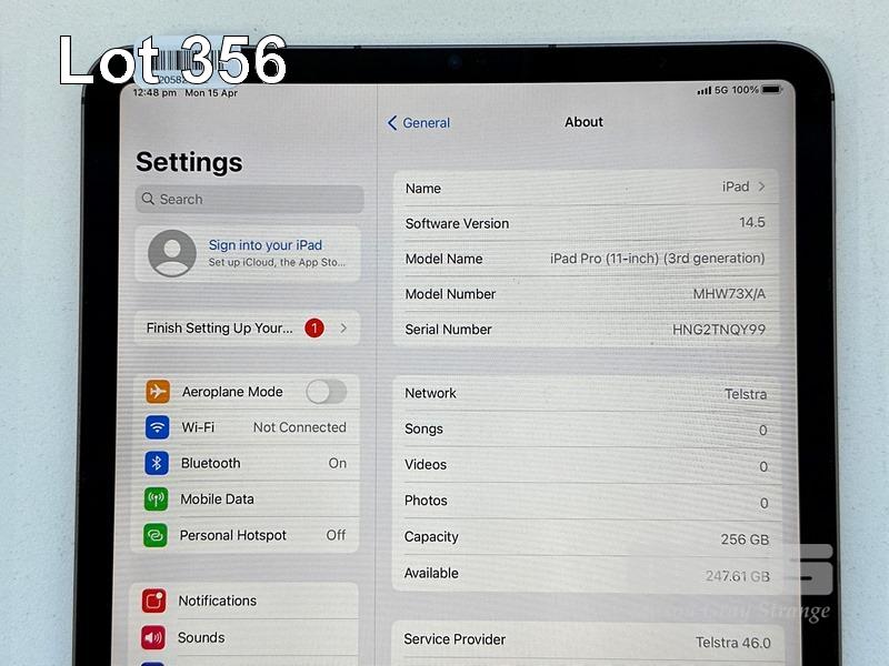 APPLE iPAD PRO, 11", 3RD GEN, M1, 256GB, Wi-Fi, CELLULAR, SPACE GREY, MODEL MHW73X/A, A2459 WITH APPLE PENCIL, ADAPTER, CABLE & CHARGER S/N:HNG2TNQY99