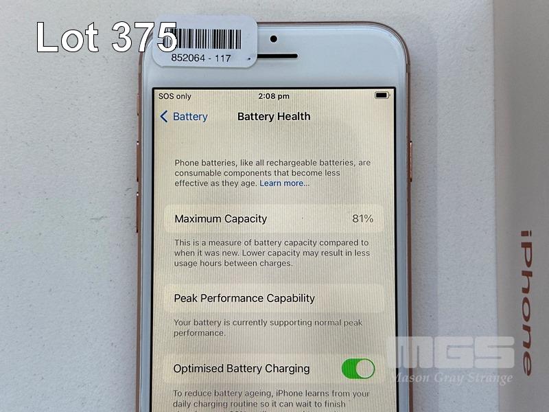 APPLE iPHONE 8, 256GB, GOLD, MODEL MQ7H2X/A, BATTERY HEALTH 81% (NO CABLE, NO CHARGER) (NOTE: DAMAGED BACK) S/N:C7CVHNVZJC6Q