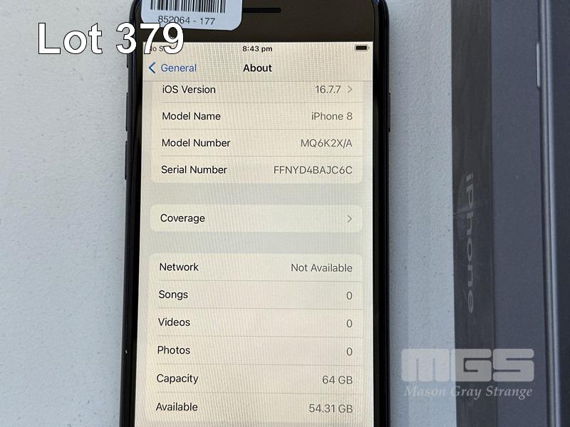 APPLE iPHONE 8, 64GB, SPACE GREY, MODEL MQ6K2X/A, BATTERY HEALTH 100% (NO CABLE, NO CHARGER) S/N:FFNYD4BAJC6C