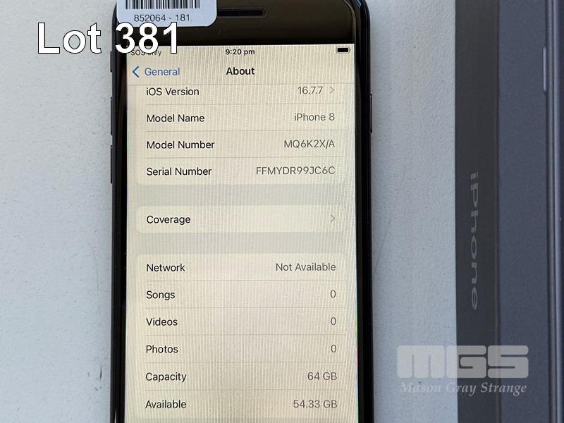 APPLE iPHONE 8, 64GB, SPACE GREY, MODEL MQ6K2X/A, BATTERY HEALTH 99% (NO CABLE, NO CHARGER) S/N:FFMYDR99JC6C