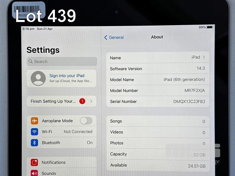 APPLE iPAD (6TH GEN), 32GB, Wi-Fi, SPACE GREY, MODEL MR7F2X/A, A1893 (NO CABLE, NO CHARGER) S/N:DMQX1JCJJF8J
