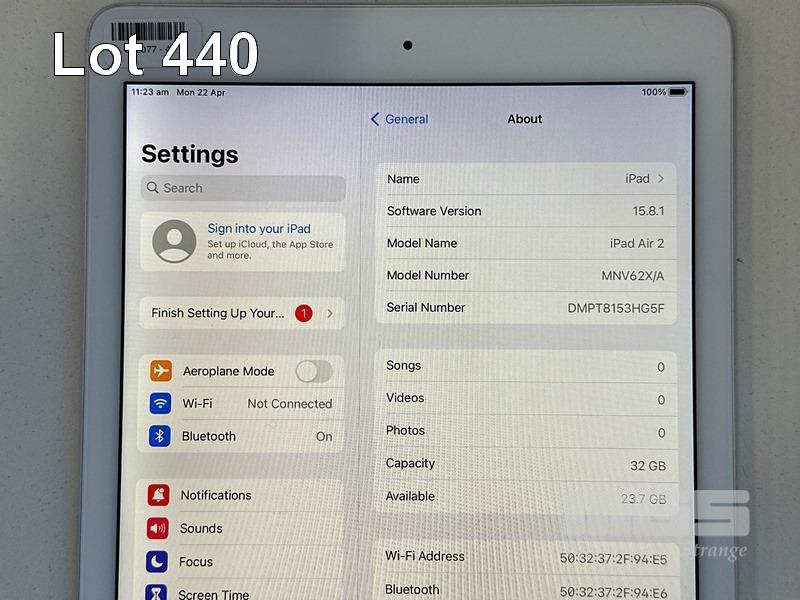 APPLE iPAD AIR 2, 32GB, Wi-Fi, SILVER, MODEL MNV62X/A, A1566 (NO CABLE, NO CHARGER) S/N:DMPT8153HG5F