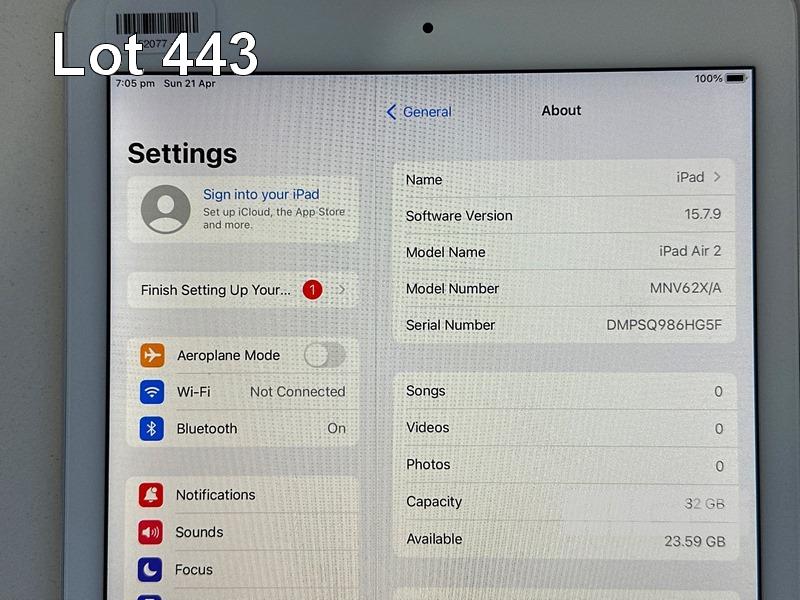 APPLE iPAD AIR 2, 32GB, Wi-Fi, SILVER, MODEL MNV62X/A, A1566 (NO CABLE, NO CHARGER) S/N:DMPSQ986HG5F
