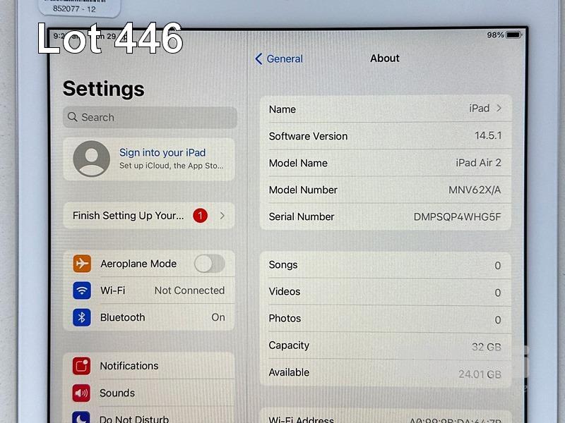 APPLE iPAD AIR 2, 32GB, Wi-Fi, SILVER, MODEL MNV62X/A, A1566 (NO CABLE, NO CHARGER) S/N:DMPSQP4WHG5F