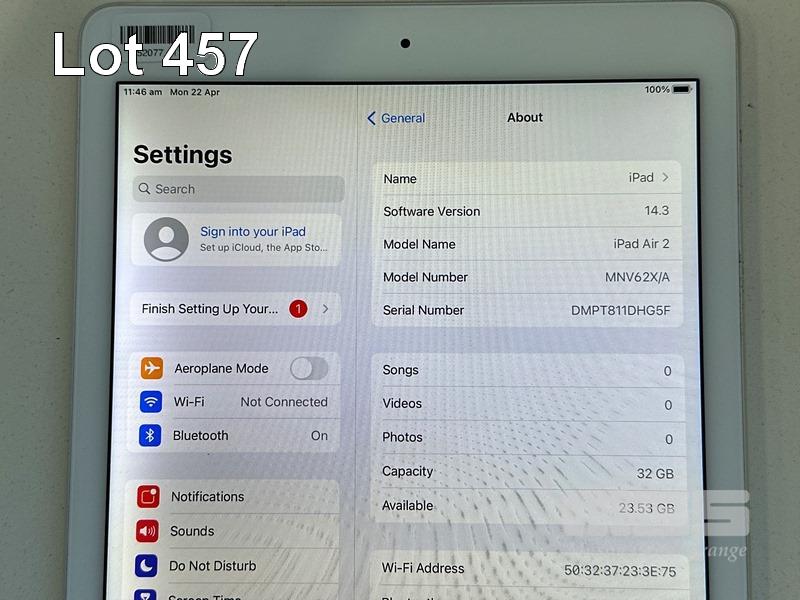 APPLE iPAD AIR 2, 32GB, Wi-Fi, SILVER, MODEL MNV62X/A, A1566 (NO CABLE, NO CHARGER) (NOTE: BRIGHT SPOT SCREEN BLEMISH) S/N:DMPT811DHG5F