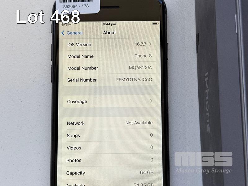 APPLE iPHONE 8, 64GB, SPACE GREY, MODEL MQ6K2X/A, BATTERY HEALTH 86% (NO CABLE, NO CHARGER) S/N:FFMYDTNAJC6C