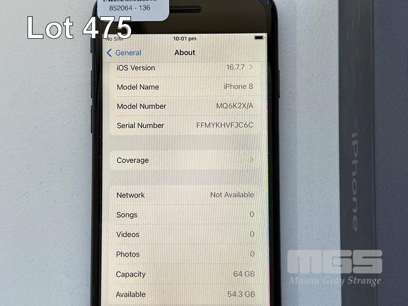 APPLE iPHONE 8, 64GB, SPACE GREY, MODEL MQ6K2X/A, BATTERY HEALTH 84% (NO CABLE, NO CHARGER) S/N:FFMYKHVFJC6C