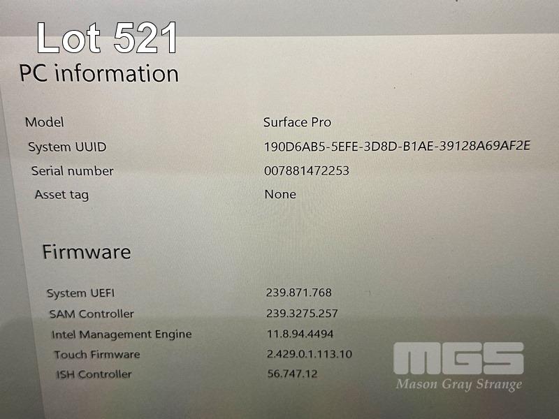 TABLET PC, MICROSOFT SURFACE PRO 5TH GEN, MODEL 1796, CORE m3-7Y30 (7TH GEN) @ 1GHz, 4GB RAM, 128GB SSD, 12.3" TOUCHSCREEN (2736x1824), INTEL HD GRAPHICS 615, Wi-Fi, BLUETOOTH, WINDOWS 10 PRO INSTALLED & KEYBOARD TYPE COVER (NO POWER SUPPLY) S/N:007881472253