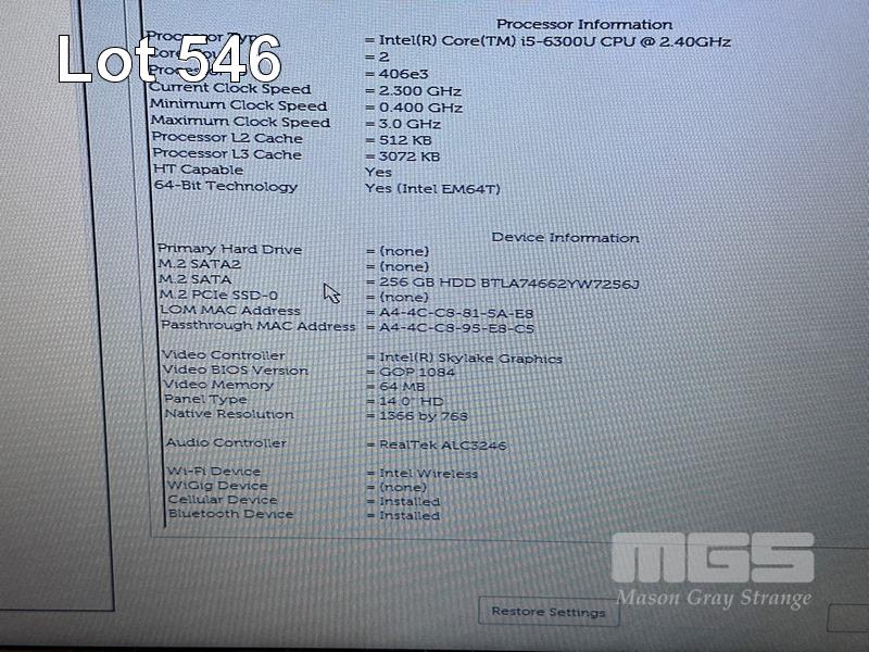 LAPTOP, DELL LATITUDE 5480, CORE i5 6300U (6TH GEN) @ 2.4GHz, 8GB DDR4 RAM, 256GB M.2 SSD, 14" WIDESCREEN (1366x768), INTEL HD GRAPHICS 520, Wi-Fi, CELLULAR, BLUETOOTH, WINDOWS 10 PRO INSTALLED & POWER SUPPLY (NOTE: MINOR MARKS ON SCREEN) S/N:BM6V3M2