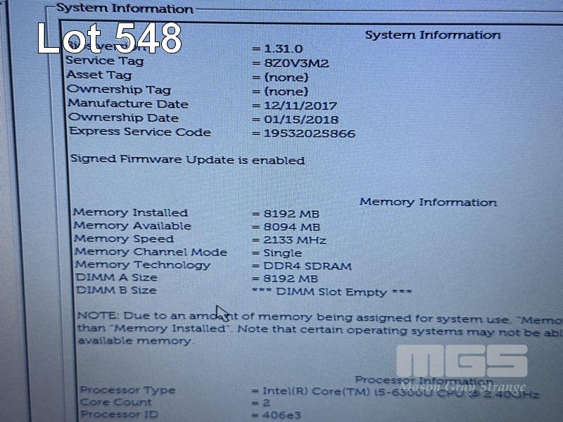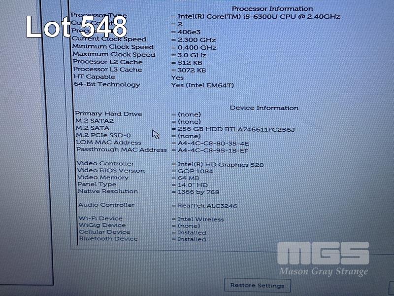 LAPTOP, DELL LATITUDE 5480, CORE i5 6300U (6TH GEN) @ 2.4GHz, 8GB DDR4 RAM, 256GB M.2 SSD, 14" WIDESCREEN (1366x768), INTEL HD GRAPHICS 520, Wi-Fi, CELLULAR, BLUETOOTH, WINDOWS 10 PRO INSTALLED & POWER SUPPLY (NOTE: MINOR MARKS ON SCREEN) S/N:8Z0V3M2