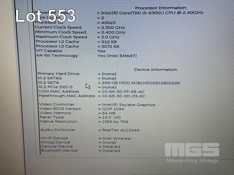 LAPTOP, DELL LATITUDE 5480, CORE i5 6300U (6TH GEN) @ 2.4GHz, 8GB DDR4 RAM, 256GB M.2 SSD, 14" WIDESCREEN (1366x768), INTEL HD GRAPHICS 520, Wi-Fi, CELLULAR, BLUETOOTH, WINDOWS 10 PRO INSTALLED & POWER SUPPLY (NOTE: MARKS ON SCREEN) S/N:7VFYZM2