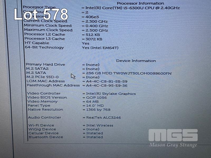 LAPTOP, DELL LATITUDE 5480, CORE i5 6300U (6TH GEN) @ 2.4GHz, 8GB DDR4 RAM, 256GB M.2 SSD, 14" WIDESCREEN (1366x768), INTEL HD GRAPHICS 520, Wi-Fi, CELLULAR, BLUETOOTH, WINDOWS 10 PRO INSTALLED & POWER SUPPLY (NOTE: MARKS & BRIGHT SPOT ON SCREEN) S/N:2X0V3M2
