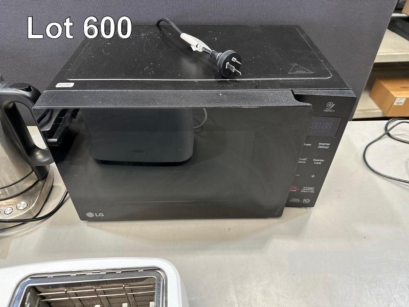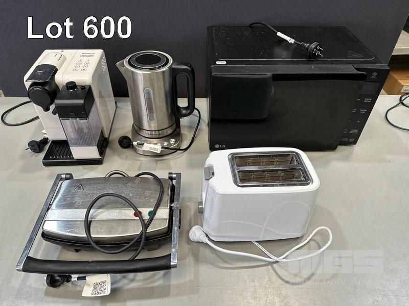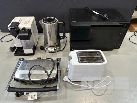 LG MS2336DB MICROWAVE, DELONGHI NESPRESSO COFFEE POD MACHINE, KETTLE, SANDWICH PRESS & TOASTER