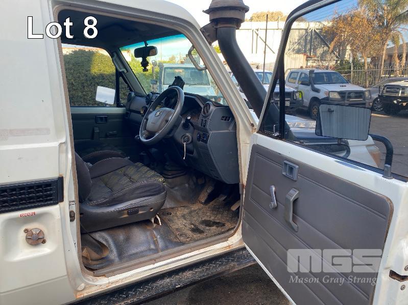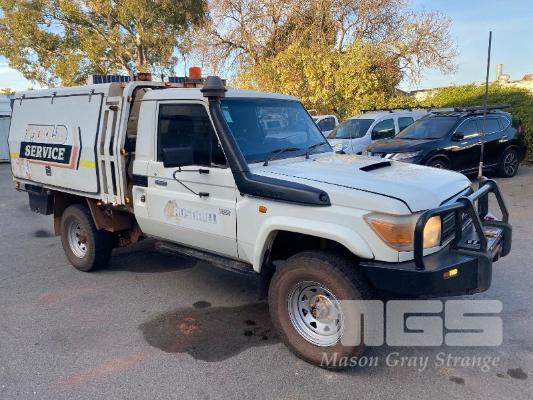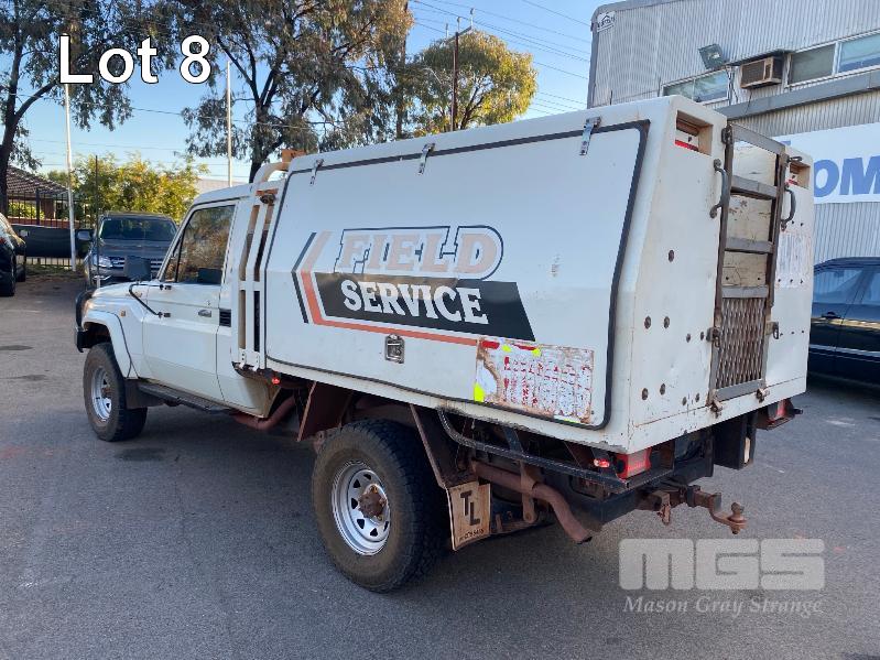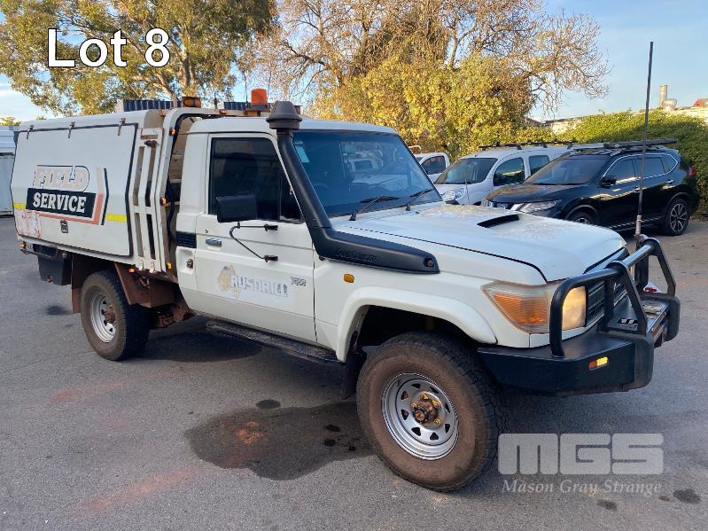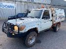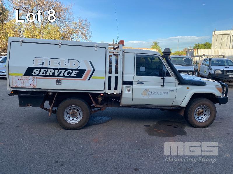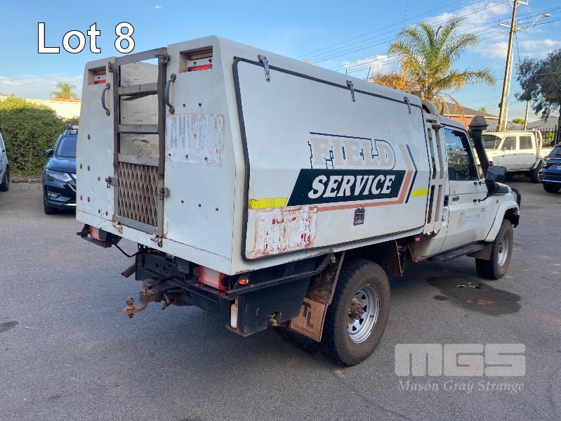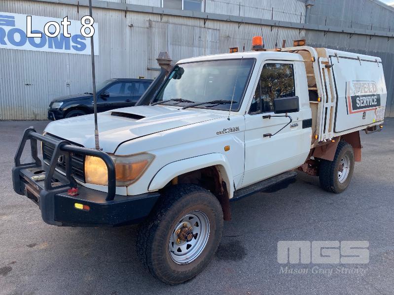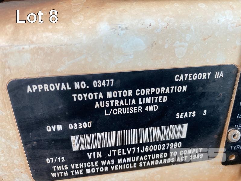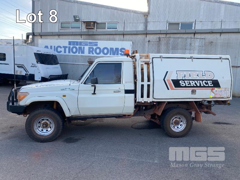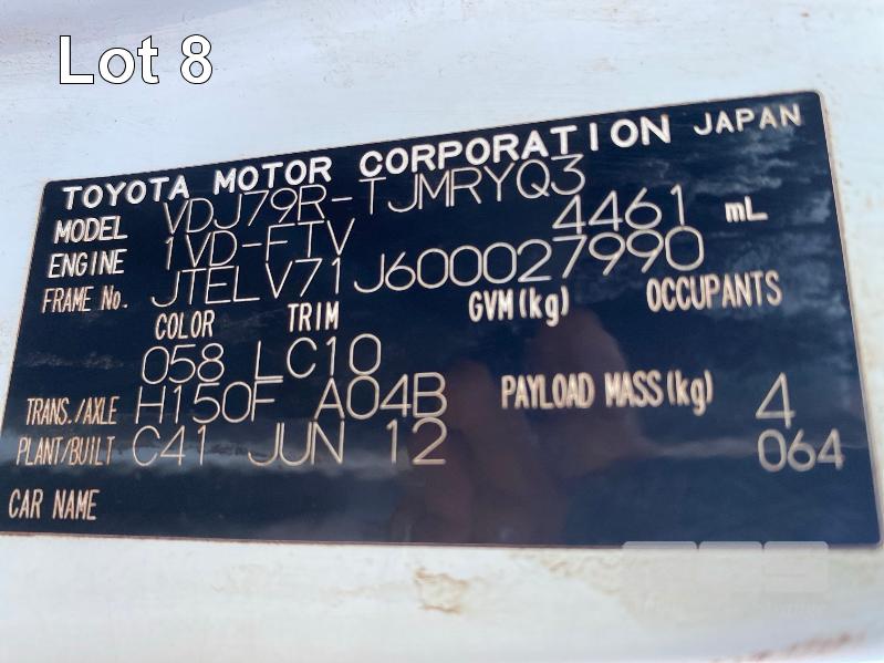 2012 TOYOTA LANDCRUISER VDJ79R-TJMRYQ3 SINGLE CAB SERVICE BODY 4x4 REG: NO PLATES VIN: JTELV71J600027990 ENG: 1VDO171655 ODO: 305,665kms SHOWING 4.5 LITRE V8 TURBO DIESEL, 5 SPEED MANUAL TRANSMISSION, WHITE DUCO, 2 DOORS, 2 SEAT, 4x4 AIR BAG, AIR CON, BULL BAR, CRUISE CONTROL, DECALS, SHELVING, SIDE STEP, TOW BAR, WARNING LIGHTS, 2 x SPARE WHEELS DUAL BATTERIES BATTERY ISOLATION SWITCH SUB FUEL TANK SERVICE BODY FITTED WITH GAS LIFT SIDE DOORS REAR HINGED STEP, SWING OUT VICE & WATER TANK KEY #11 (WITH 1 KEY/S)