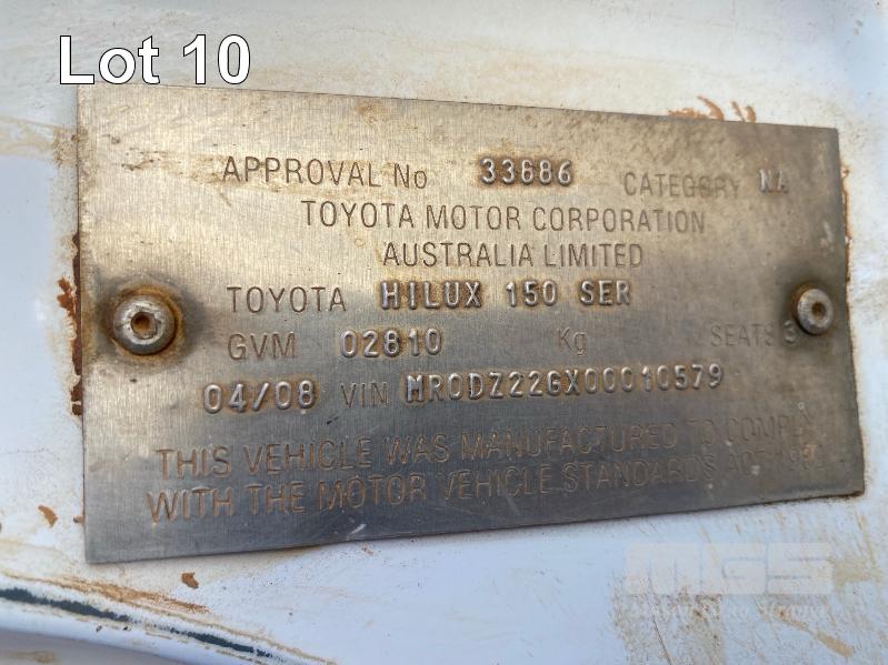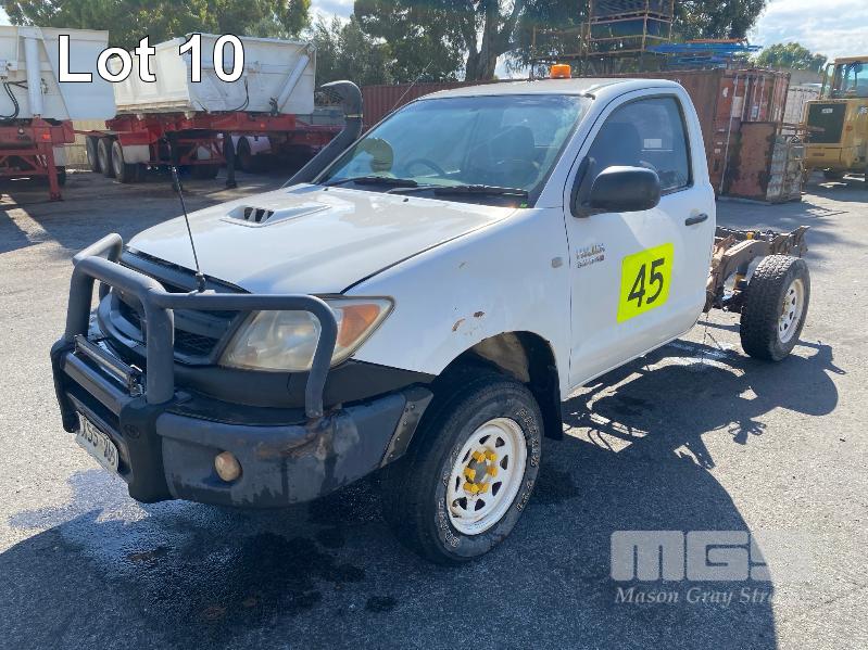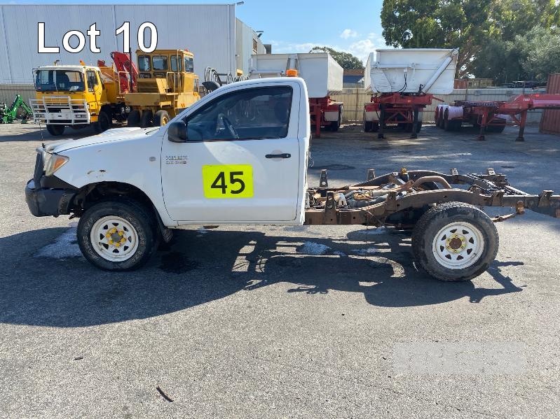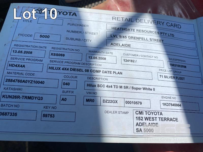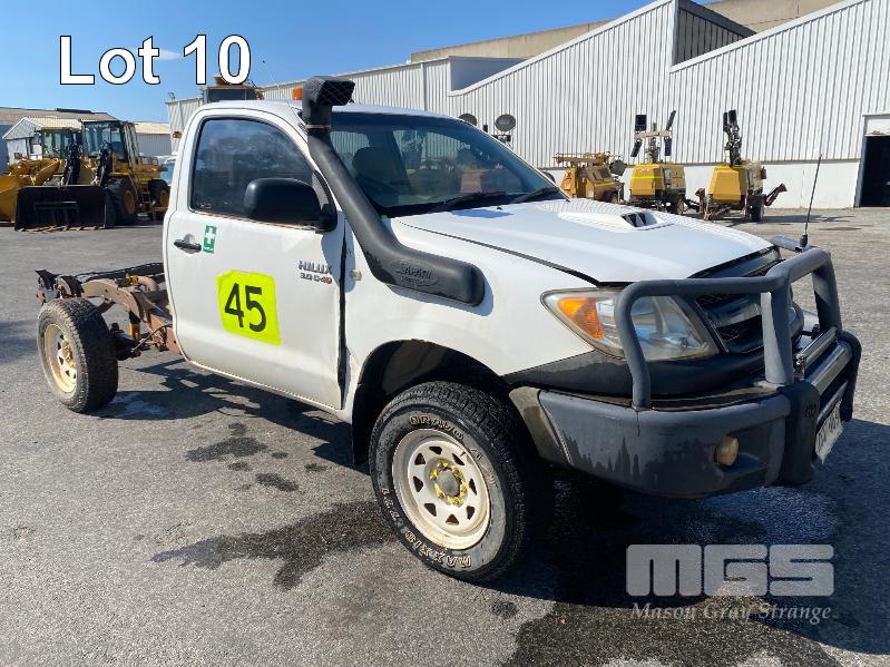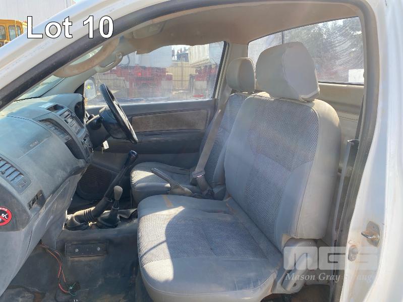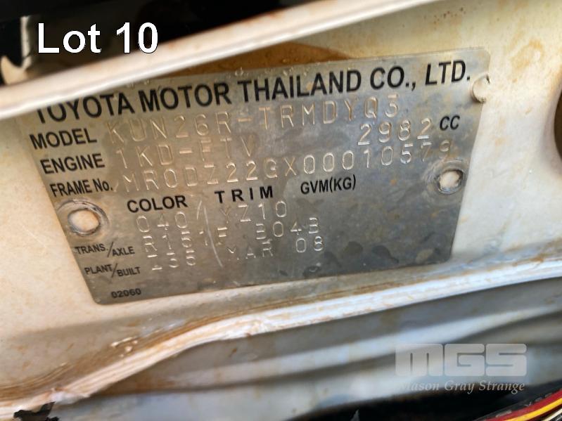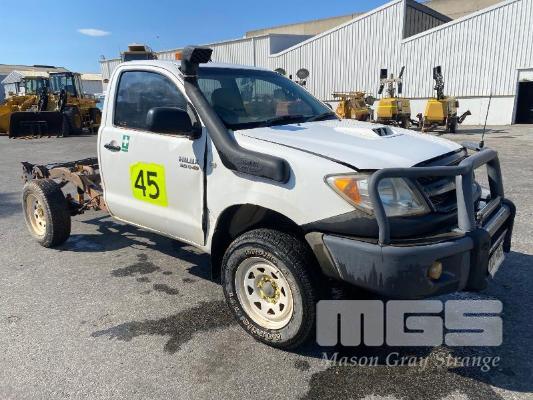 2008 TOYOTA HILUX KUN26R-TRMDVQS 150 SERIES SINGLE CAB CHASSIS 4x4 REG: XSS 069 (SA) VIN: MR0DZ22GX00010579 ENG: 1KD7545994 ODO: 266,564kms SHOWING PLANT NO: LV45 3.0 LITRE TURBO DIESEL, 5 SPEED MANUAL TRANSMISSION, WHITE DUCO, 2 DOORS, 3 SEAT, 4x4 AIR BAG, AIR CON, BULL BAR, POWER STEERING, TOW BAR, SNORKEL AIR INTAKE KEY #7 (WITH PAPERS, WITH 2 KEY/S, WITH OWNER'S MANUAL, WITH SERVICE BOOKS) CONDITION: BODY - DENTS & SCRATCHES