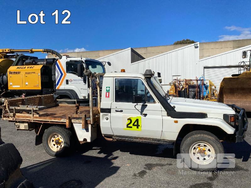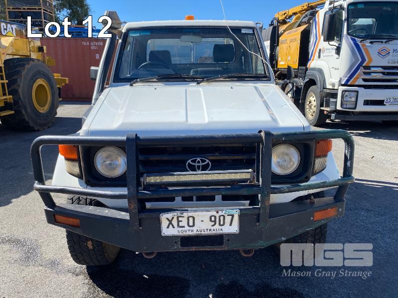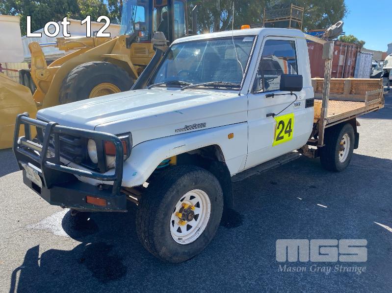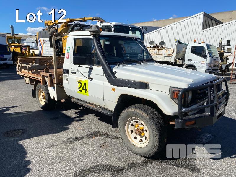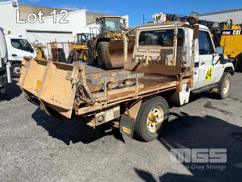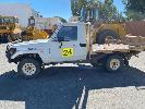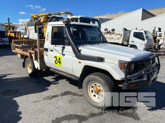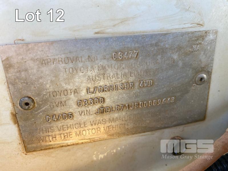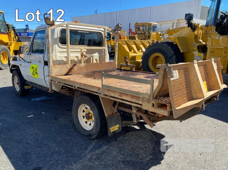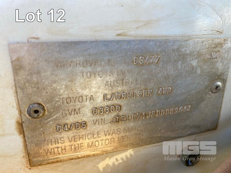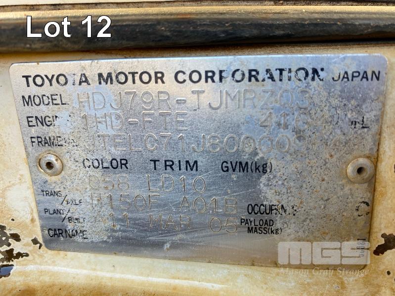 2005 TOYOTA LANDCRUISER HDJ79R-TJMRZQ3 SINGLE CAB TRAY UTILITY 4 x 4 REG: XEO 907 (SA) VIN: JTELC71J800009643 ENG: 1HD0279022 ODO: 381,967 kms SHOWING PLANT NO: LV24 4.2 LITRE, 5 SPEED MANUAL, TURBO DIESEL, WHITE DUCO, 2 DOORS, 3 SEAT, 4 x 4 AIR CON, BULL BAR, CARGO BARRIER, DECALS, POWER STEERING, SIDE STEP, SPOT LIGHTS, STEEL TRAY, REAR HYDRAULIC TAIL GATE LIFTER, TIEMAN, FOLDING KEY #43 (WITH PAPERS, WITH 1 KEY/S) CONDITION: BRAKES - ALL FAULTS