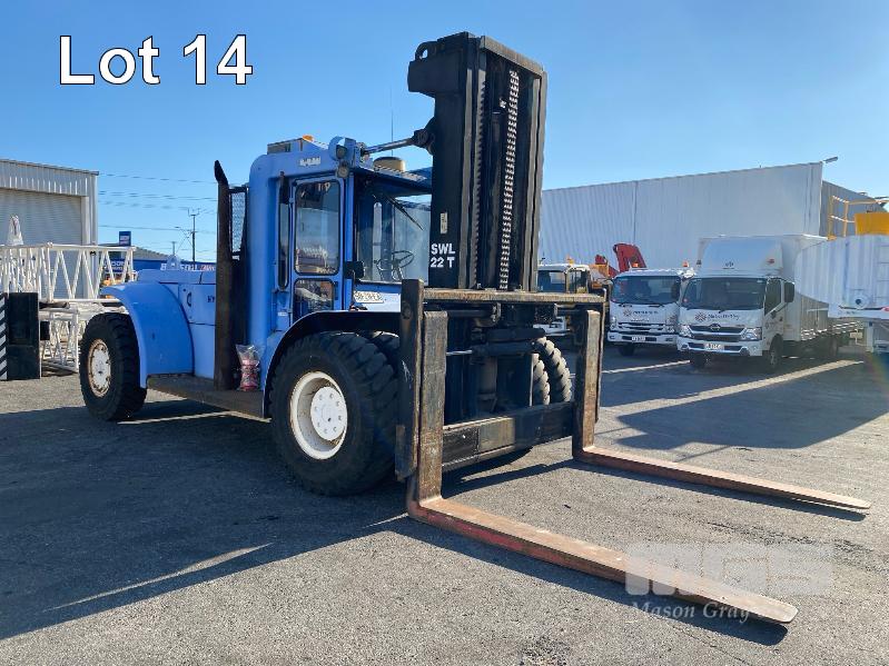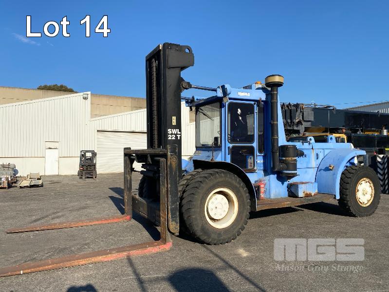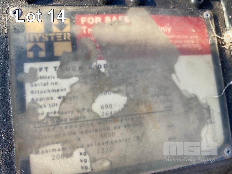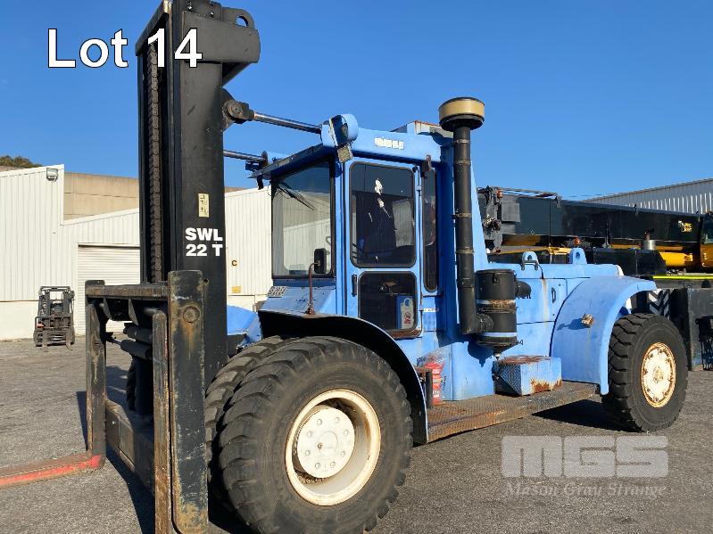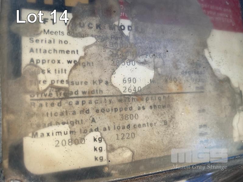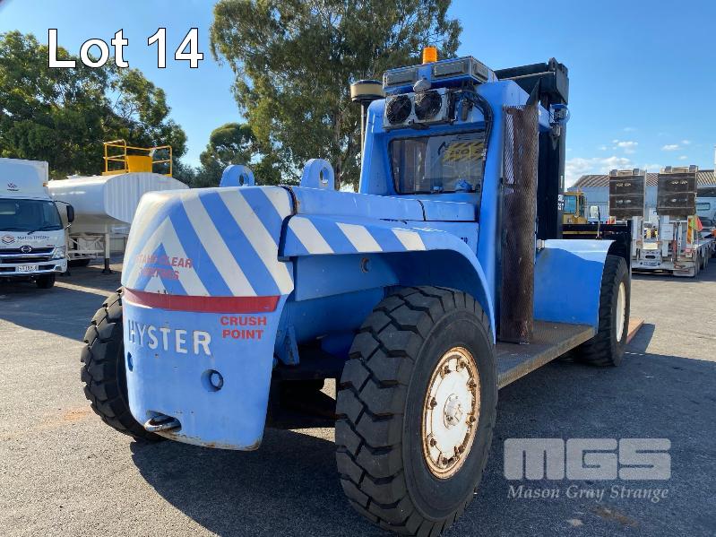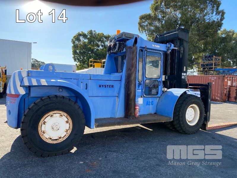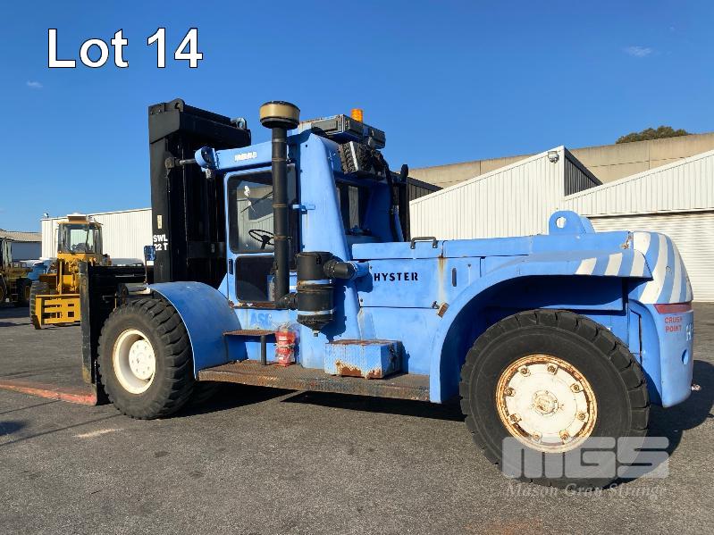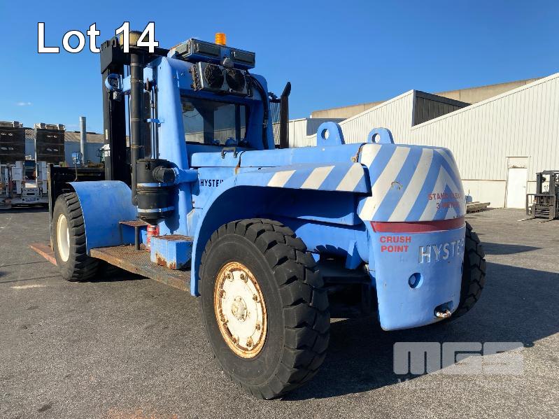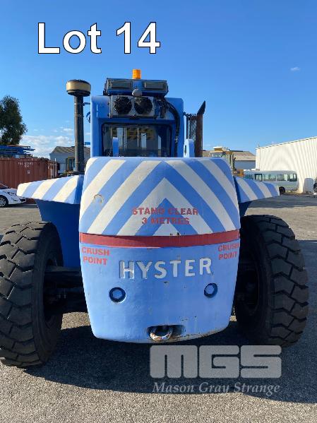 HYSTER FORKLIFT MOD: H460B S/NO: B00860Y180A REG: SB 28 EA 20 TONNE LIFT CAPACITY DETROIT V8 DIESEL ENGINE HOURS: 1,519 SHOWING 2 STAGE MAST TYNE POSITIONING FULLY ENCLOSED A/C CAB KEYPAD LOCKOUT ACCESS MAX LOAD: 20,800kg MAX LIFT HEIGHT: 3,800mm APPROX WEIGHT: 28,500kg