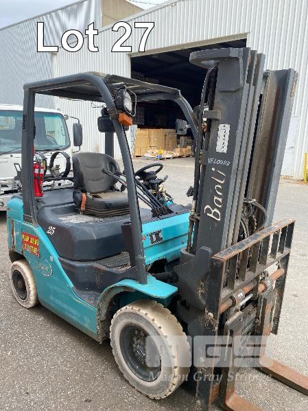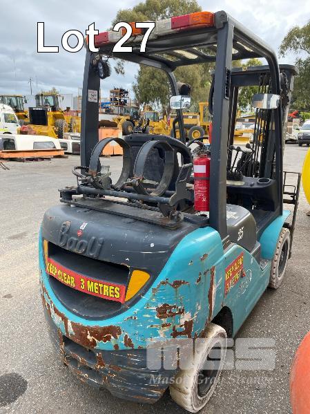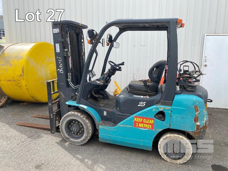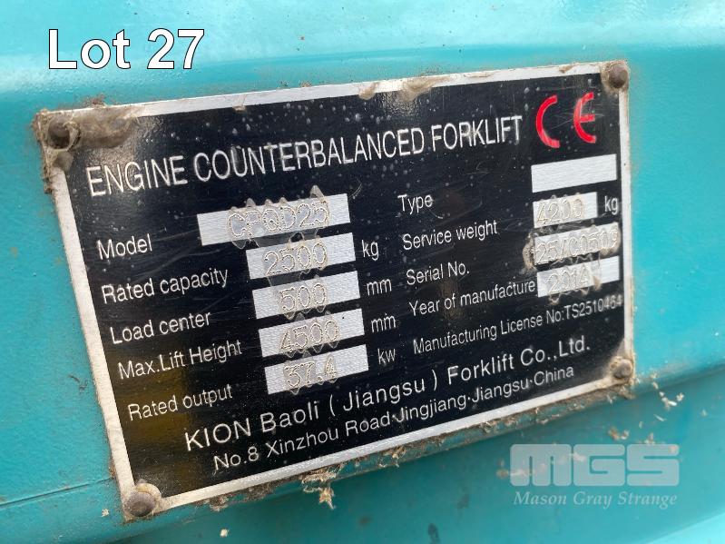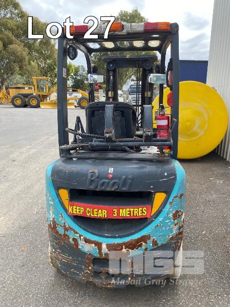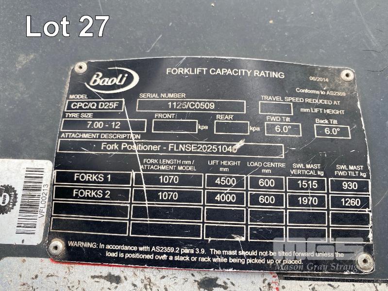 2014 KION BAOLI FORKLIFT, 2.5 TONNE MOD: CPQD25 S/NO: 1125/C0509 HOURS: 5,360 SHOWING 4 CYLINDER LPG ENGINE 3 STAGE CONTAINER MAST TYNE POSITIONING SOLID TYRES, KEYPAD SECURITY LOCK OUT RATED LIFT CAP : 1,970kg MAX LIFT HEIGHT: 4,500mm NOTE: ALL FAULTS, NOT STARTING, ELECTRICAL IGNITION FAULTS AND GAS LEAKAGES