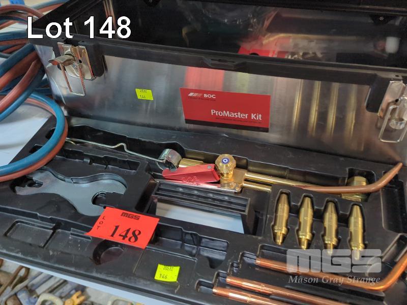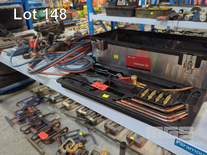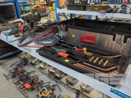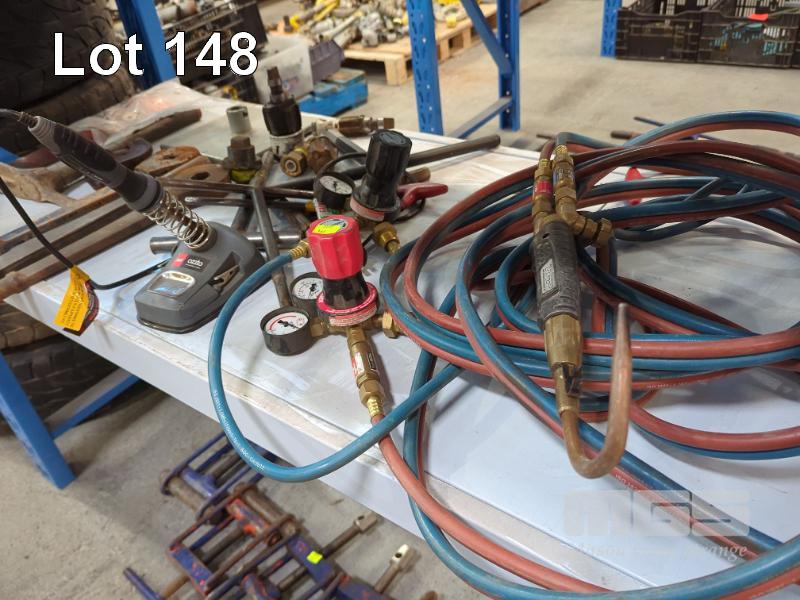 OXY ACETYLENE SET INC GAUGES, HOSE, TORCH & TIPS IN CARRY CASE, SOLDERING IRON, HAND TOOLS ETC