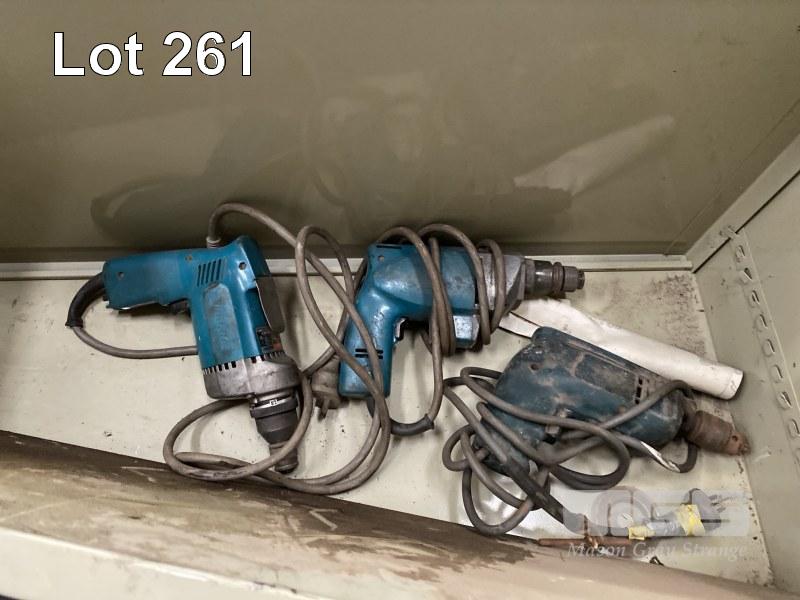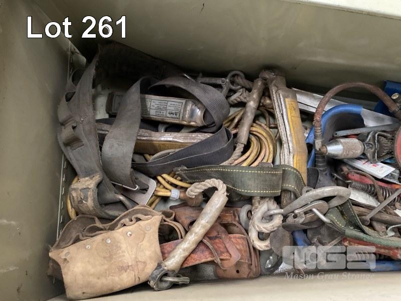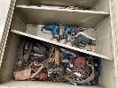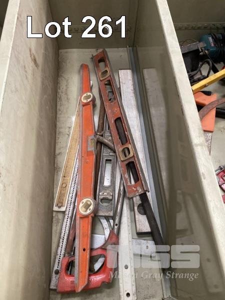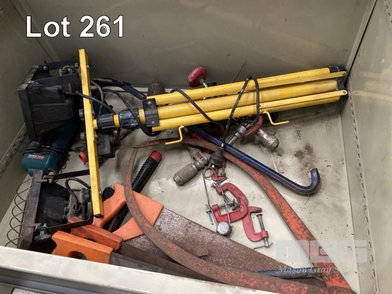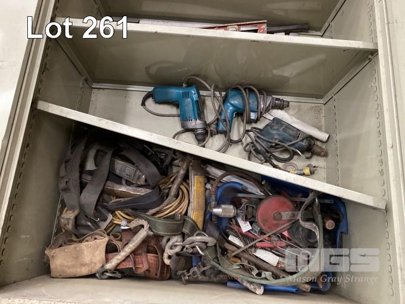 2 DOOR STEEL STORAGE CABINET & CONTENTS ASSORTED HAND TOOLS, INC SPIRIT LEVELS, SAWS, MAKITA DRILLS, DRIVERS, FALL ARREST HARNESS, ETC