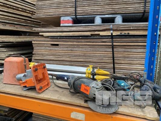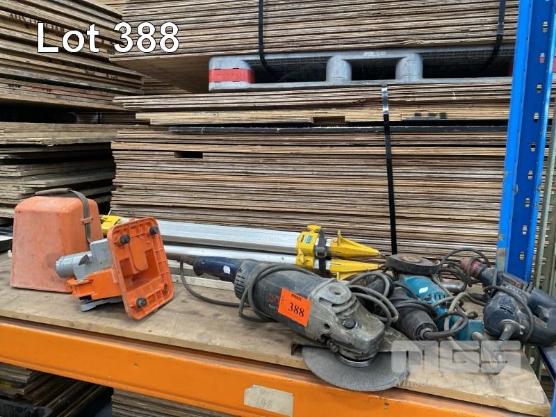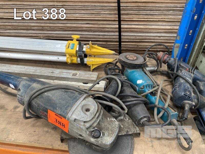 BOSCH 9" GRINDER, ANGLE & STRAIGHT GRINDER, ROTARY HAMMER DRILL, AGE, 240V WITH SURVEYING SITE LEVEL, SOKKISHA & ALLOY TRIPOD