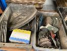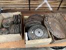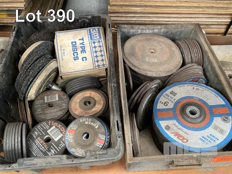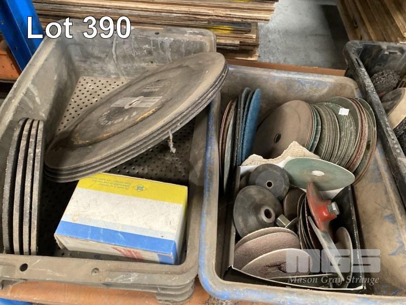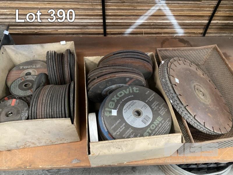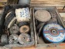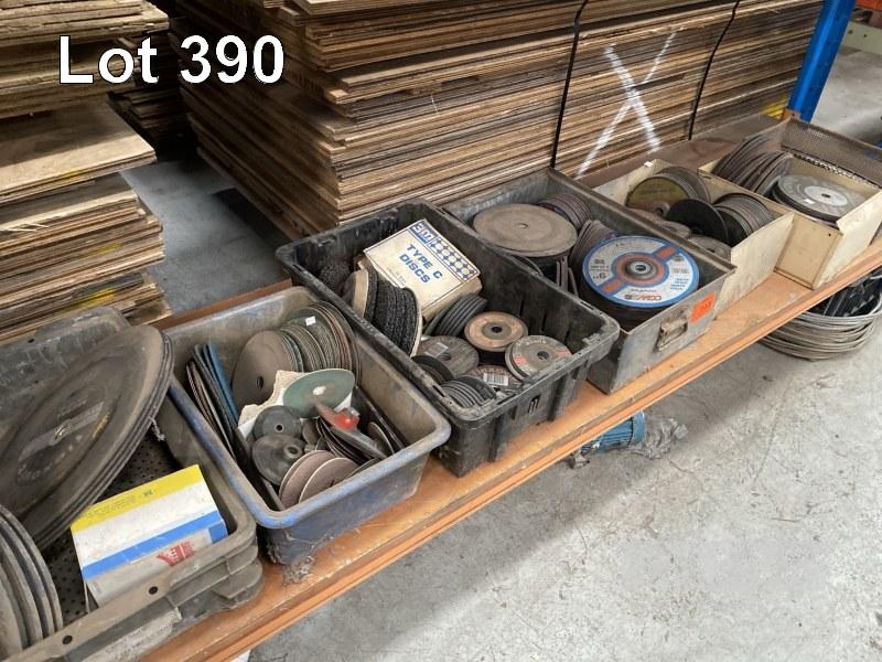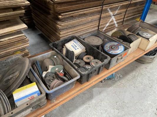 ASSORED SAW BLADES, FRICTION CUT OFF DISCS, GRINDING DISCS, SANDING DISCS, ETC VARIOUS SIZES, 7 x TRAYS, 1 x SHELF