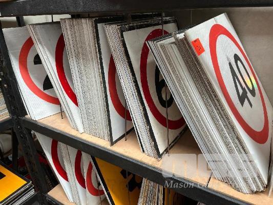 LARGE QUANTITY REFLECTIVE ROAD SIGNS, ASSORTED SPEED SIGNS, LOOSE ROAD SURFACE SIGNS, 'END ROAD WORK' 600 x 600mm APPROX 180 TOTAL