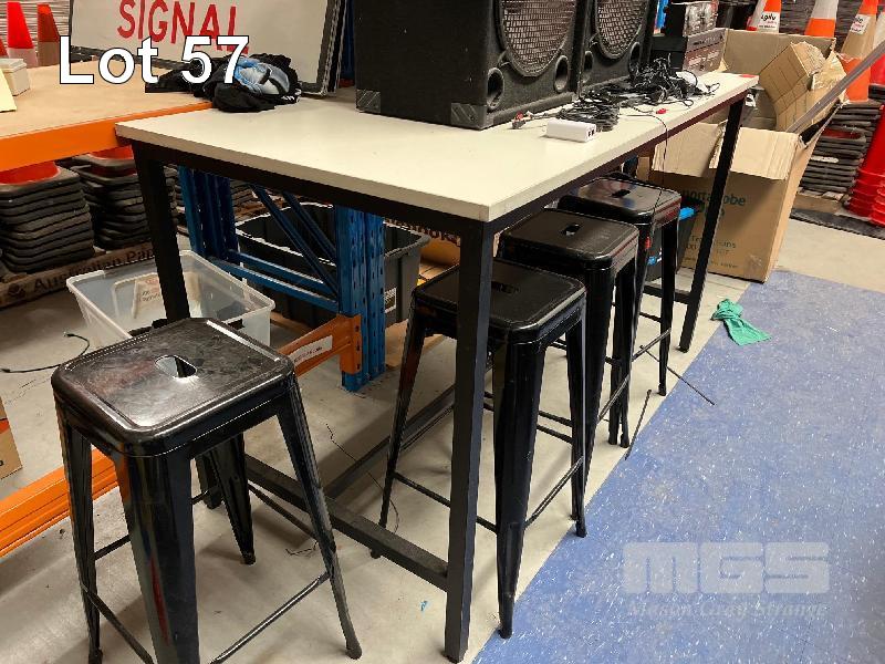 RECTANGULAR DRY BAR, TIMBER LAMINATE TOP, STEEL FRAME, 1800 x 900 x 960mm (H) WITH 4 x BLACK BAR STOOLS, STEEL