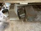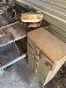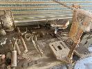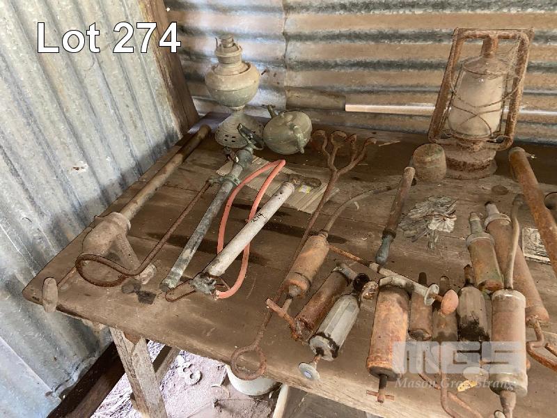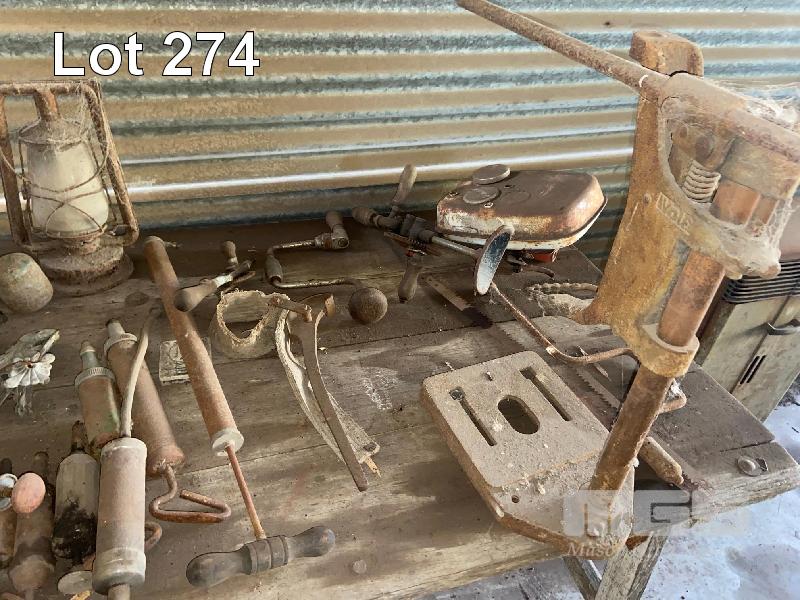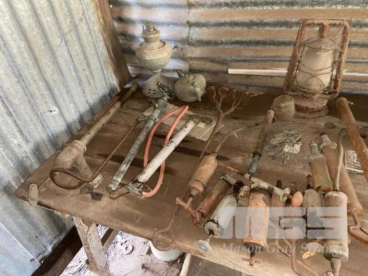OLD SCHOOL TABLE, IRONS, LUBE, PRESS, LAMPS, TANKS, BREAST DRILL, ETC