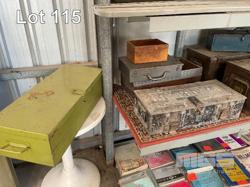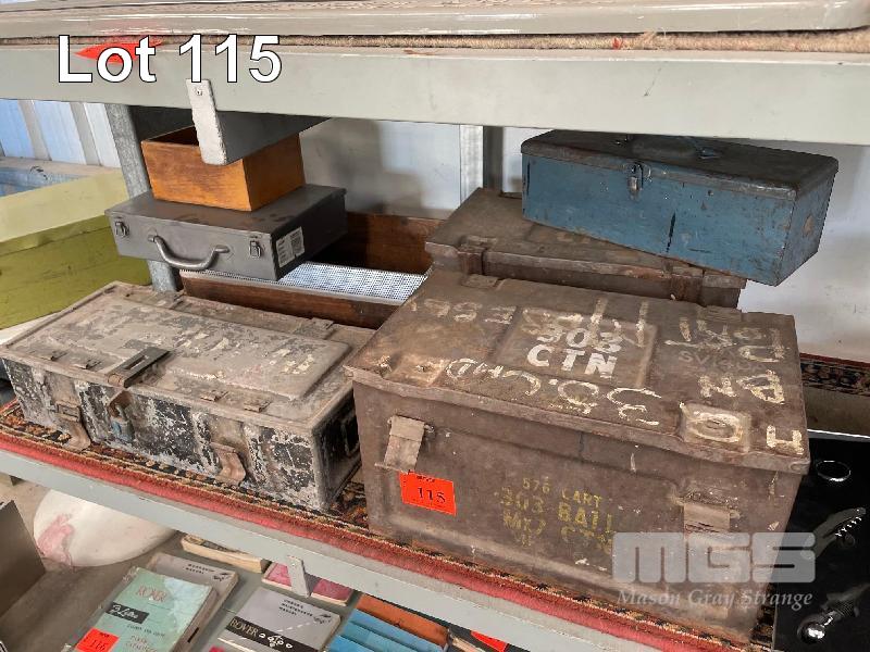 5 x ARMY AMMO BOXES, TOOL BOXES & 2 x WOODEN OLD CRATES