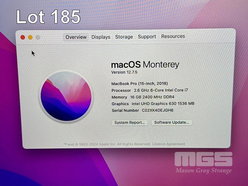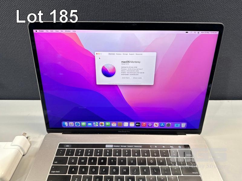LAPTOP, APPLE MACBOOK PRO (A1990), CORE i7 8850H (8TH GEN) @ 2.6GHz, 16GB DDR4 RAM, 1TB SSD, 15.4" RETINA DISPLAY (2880x1800), INTEL UHD GRAPHICS 630, Wi-Fi, BLUETOOTH, MAC OS 12 INSTALLED & USB-C POWER SUPPLY (NOTE: MINOR MARKS ON SCREEN) S/N:C02XK4DEJGH6