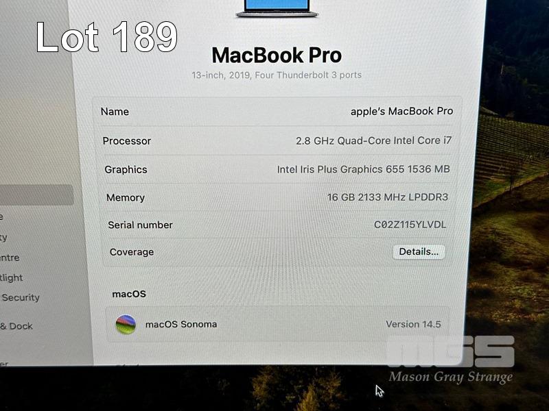 LAPTOP, APPLE MACBOOK PRO (A1989), CORE i7 8569U (8TH GEN) @ 2.8GHz, 16GB DDR3 RAM, 1TB SSD, 13.3" RETINA DISPLAY (2560x1600), INTEL IRIS PLUS GRAPHICS 655, Wi-Fi, BLUETOOTH, MAC OS 14 INSTALLED & USB-C POWER SUPPLY (NOTE: MARKS ON SCREEN) S/N:C02Z115YLVDL