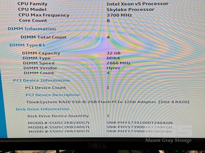 RACKMOUNT SERVER, LENOVO THINKSYSTEM SR630, 2U, 2 x XEON GOLD 6134 @ 3.2GHz, 128GB ECC DDR4 RAM, 3 x 240GB SSD, 2 x 750W PSU (NO CABLES) S/N:J3005VW0