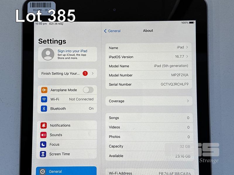 APPLE iPAD 5TH GEN, 32GB, Wi-Fi, SPACE GREY, MODEL MP2F2X/A, A1822 (NO CABLE, NO CHARGER) S/N:GCTVQJRCHLF9