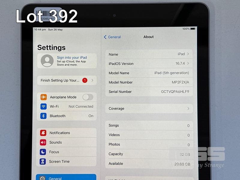 APPLE iPAD 5TH GEN, 32GB, Wi-Fi, SPACE GREY, MODEL MP2F2X/A, A1822 (NO CABLE, NO CHARGER) S/N:GCTVQPA6HLF9