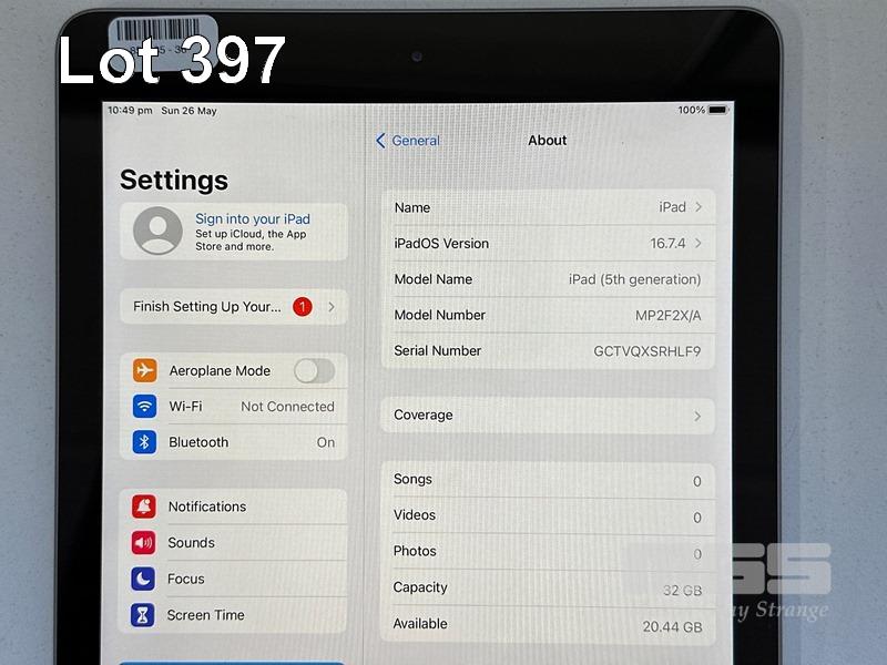 APPLE iPAD 5TH GEN, 32GB, Wi-Fi, SPACE GREY, MODEL MP2F2X/A, A1822 (NO CABLE, NO CHARGER) S/N:GCTVQXSRHLF9