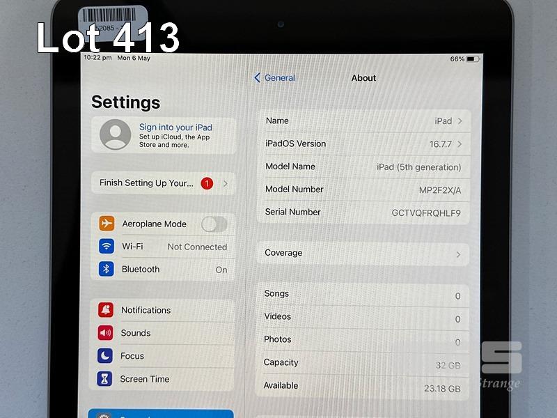 APPLE iPAD 5TH GEN, 32GB, Wi-Fi, SPACE GREY, MODEL MP2F2X/A, A1822 (NO CABLE, NO CHARGER) S/N:GCTVQFRQHLF9