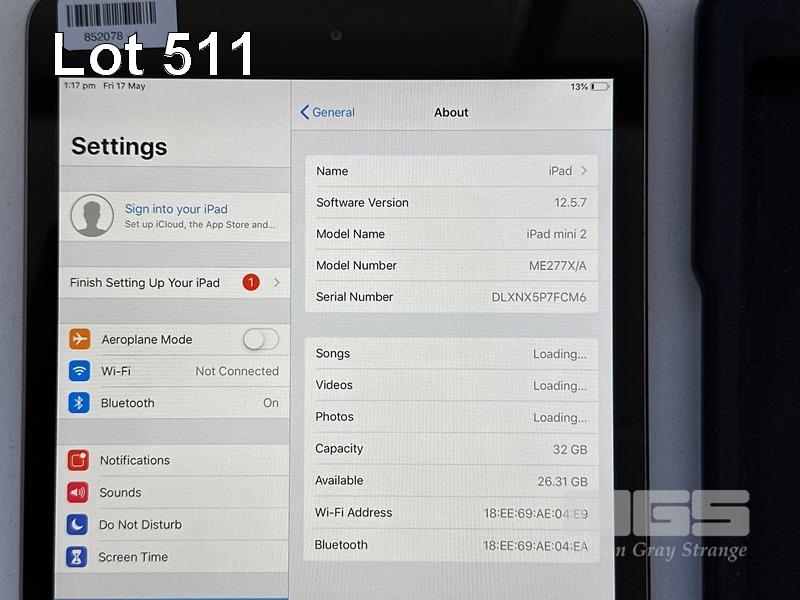APPLE iPAD MINI 2, 32GB, Wi-Fi, SPACE GREY, MODEL ME277X/A, A1489 (NO CABLE, NO CHARGER) S/N:DLXNX5P7FCM6