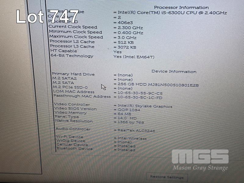 LAPTOP, DELL LATITUDE 5480, CORE i5 6300U (6TH GEN) @ 2.4GHz, 8GB DDR4 RAM, 256GB M.2 SSD, 14" WIDESCREEN (1366x768), INTEL HD GRAPHICS 520, Wi-Fi, CELLULAR, BLUETOOTH, WINDOWS 10 PRO INSTALLED & POWER SUPPLY (NOTE: MINOR MARKS ON SCREEN) S/N:6XYYZM2