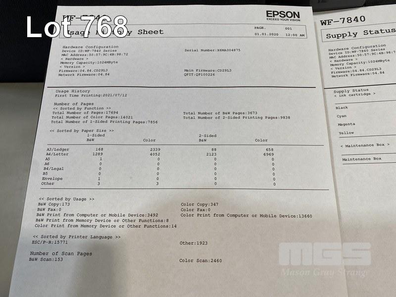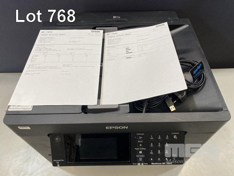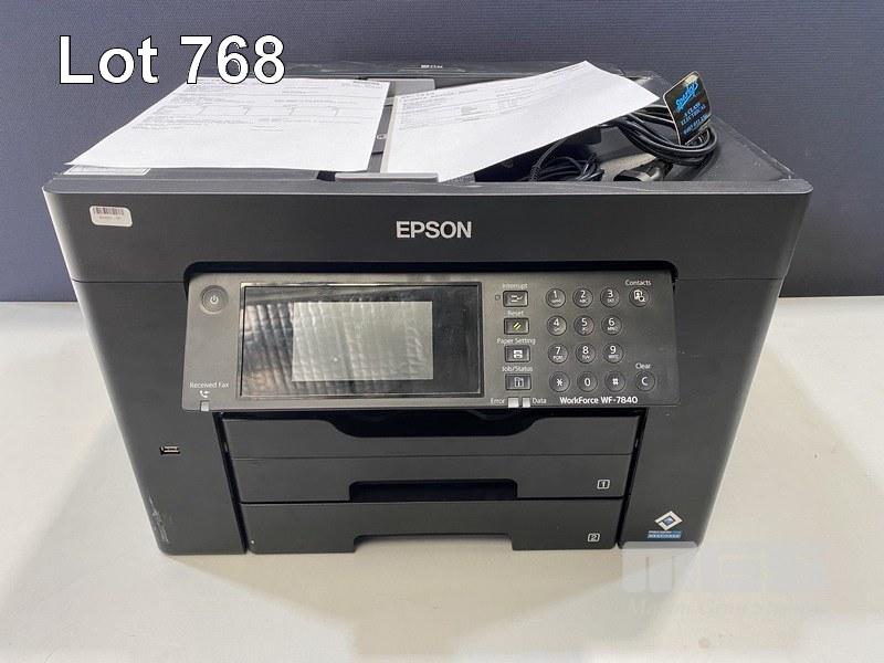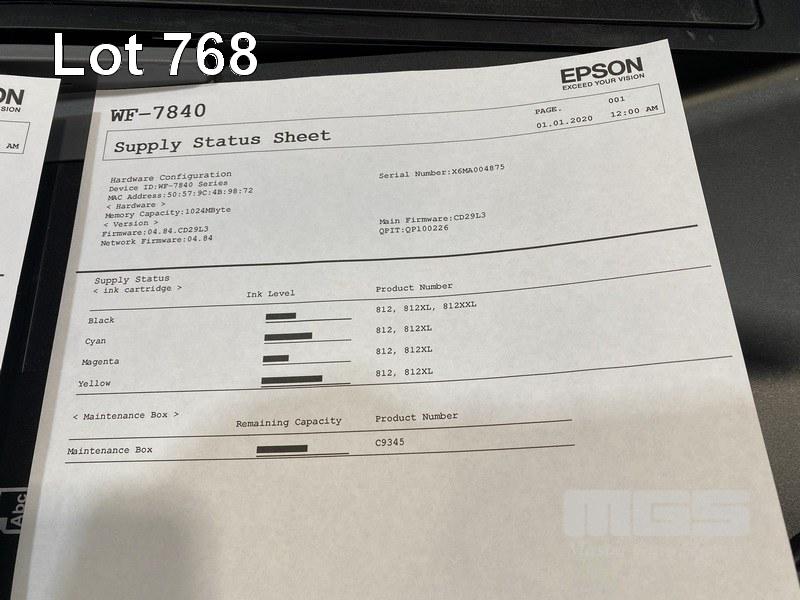 PRINTER, EPSON WORKFORCE WF-7840 MFC INKJET, USB, NETWORK, 14,021 COLOUR & 3,673 B&W PAGES (TEST PAGE ATTACHED) S/N:X6MA004875