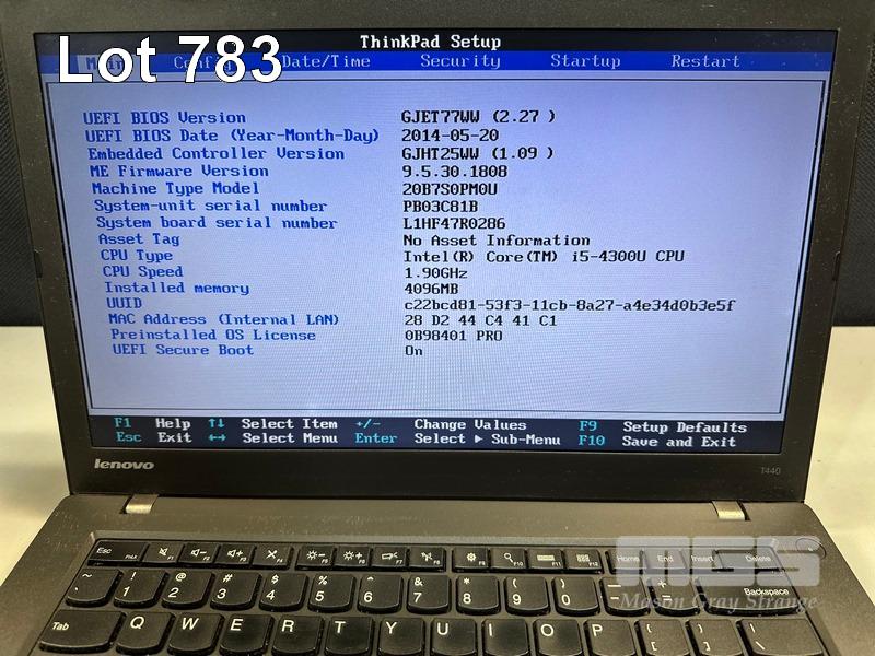 LAPTOP, LENOVO THINKPAD T440, TYPE 20B7, CORE i5 4300U (4TH GEN) @ 1.9GHz, 4GB DDR3 RAM, 275GB SSD, 14" WIDESCREEN (1366x768), INTEL HD VIDEO, Wi-Fi, BLUETOOTH, WINDOWS 10 PRO INSTALLED & POWER SUPPLY (NOTE: BRIGHT SPOTS ON SCREEN) S/N:PB03C81B